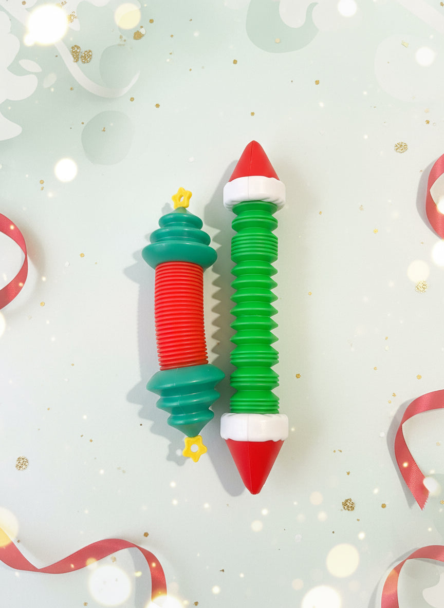 Celebrate the holidays with these Christmas Pop Tubes, designed in festive colors and shapes! Each tube is made from durable, flexible plastic that can be stretched, twisted, and bent to create a satisfying popping sound. The designs include holiday motifs such as Christmas trees, Santa hats and stars, making them perfect for stocking stuffers, party favours, or classroom prizes.